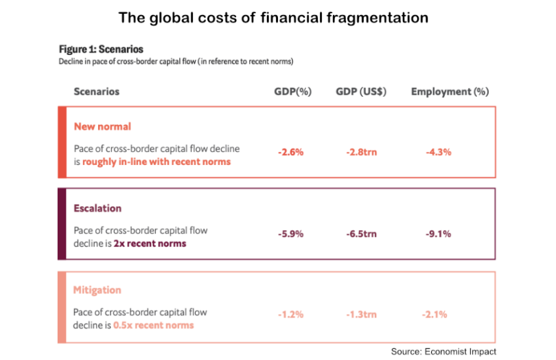 The Economist Impact has published a report on the cost of global financial fragmentation, sponsored by Swift. Based on the current trajectory of sanctions and trade barriers, the resulting financial fragmentation is expected to globally cost $2.8 trillion or 2.6% of GDP. If the negative trend escalates (doubles), the cost could be $6.5 trillion. However, it’s also possible that steps could be taken to mitigate the fragmentation, which could reduce the impact to $1.3 trillion.